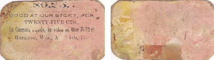 Comments: H. A. Peck and Rufus A. Orvis operated their drug and grocery business in Baraboo from 1857 to 1863 per Hartzog. The handwritten “& Orvis” remnant of their name can barely be made out on the signature line at the bottom on the front of this well-worn pink chit. On the back, the handwritten name H. A. Peck and “No.59” are somewhat more distinct. The month and day of the printed date are read- able, but only the digits 18— of the year are legible. At present this chit is unique so a collector who wants it to match his/her token cannot be fussy about condition. Hopefully more examples will come to light in the future. No imprint; only the one denomination presently known.