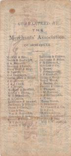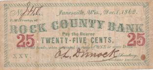 Comments: This scrip mate has something in common with the CWT WI480A-1a in that it advertises two different CWT merchants on the same piece, E. Connell & Co. and M. Harsh. They are among 47 members of the Janesville Merchants’ Association who are named on the back of this note, issued in the name of the association and signed by its member-secretary, E. L. Dimock, of Jackman & Dimock. It is drawn on the association’s account at the Rock County Bank, of which F. W. Crosby was an officer and a likely relative of the bank’s cashier, James B. Crosby. An unknown person’s initials J.H.V. (?) appear in the serial number space. Per Krause, 1 to 5 examples are known, this being the Krause plate specimen. A .15 denomination also exists. No imprint.