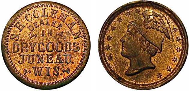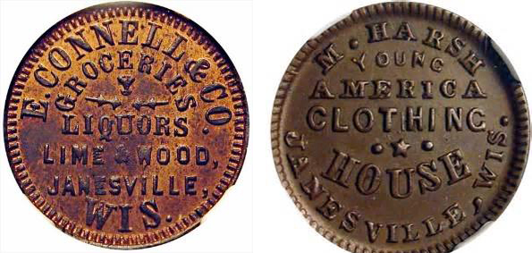 (This wonderful article comes to NOW NEWS courtesy of the Civil War Token Society and David Gladfelter. Published as an 8-part series in the Civil War Token Journal, we are privileged to reproduce the Wisconsin segment here. Where possible I have added images of the companion Civil War Tokens. –Editor)