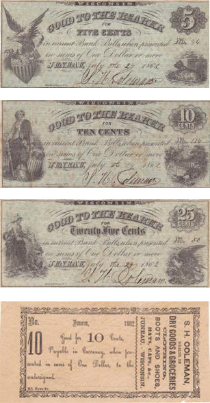 Fuld# WI320A-11p, WI320A-12p, WI320A-13p, WI320A-14p, Merchant: S.H. Coleman, Denominations: .05, .10, .25, .10, Date: July 29, 1862, (14p – 1862), Reference: Krause WI 307 SC1, SC2, SC5, (14p – Not in Krause)