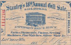 Comments: Esperson’s Brick Block, shown on this blue-lithographed advertising piece, was a commercial building in LaCrosse where various merchants had store space. George E. Stanley ran an advertisement in an 1866 business directory describing himself as a “dealer in watches, clocks & jewelry, silver plated ware, gold pens, fancy goods, perfumery, &c.”, also “pianos, melodeons, &c.” and as “general agent for the celebrated Grover & Baker’s Sewing Machines” – seemingly, everything that the cultured, well-to-do small-town Wisconsin matron might need. Stanley’s ad did not give a business address, but a close inspection of the vignette of the Esperson’s building on his 1868 note appears to show his name above the awning in front of the building. The note lists the various products in which Stanley dealt, but “farms”? On its face, the note appears to be a coupon, worth $1 off the price of an item in his “gift sale” – but why the prominent six-digit serial number? In a recent auction featuring a pair of Stanley’s notes, the cataloger speculated that it might have been one of 125,000 lottery tickets – quite a big event for an 1860s era small Wisconsin town. So here it is, call it what you like. Signed on the stone, with imprint of Western Engraving Co. Chicago.