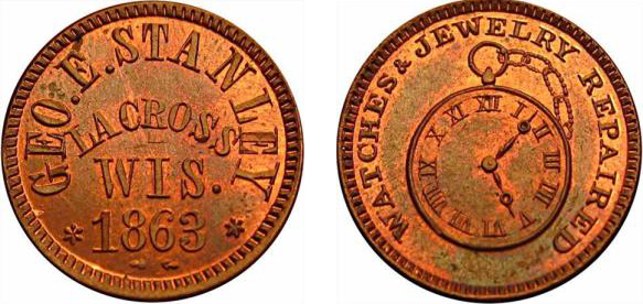 Wisconsin and Minnesota State Gazetteer, Shipper’s Guide and Business Directory for 1865 –1866, page 128 (advertisement of George E. Stanley). The State Historical Society of Wisconsin has a copy of this resource. It is useful for looking up information on businesses active in these states during these years. Doug Watson has compiled a list from this directory of Wisconsin and Minnesota merchants who issued CWT.