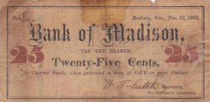 Comments: Like the Janesville note shown above, this series of scrip notes was put out by a merchant’s association, of which 20 members “and others” are named as guarantors on the back. The notes are drawn on the association’s account at the Bank of Madison and signed by its secretary, W. T. Leitch. Named members include two CWT merchants, S. Klauber & Co. and Ramsey & Campbell. The notes are without imprint. Per Krause, 6 to 10 examples are known of each of the two lowest denominations, and 1 to 5 of the .25, and also a .50 (WI-370 SC5).