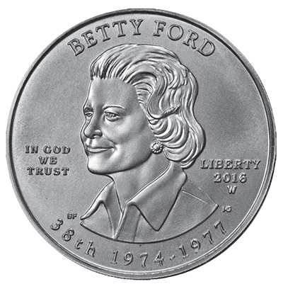 According to the United States Mint’s press release, the reverse design “features a young woman ascending a staircase, representing Mrs. Ford’s openness and advocacy regarding addiction, breast cancer awareness, and the rights of women.” During her tenure as first lady, Betty Ford had battled breast cancer, and her openness in dealing with the disease brought it to the forefront of the public’s attention. Betty Ford was also a feminist and openly supported the Equal Rights Amendment to the United States Constitution. Perhaps she is best known, however, for her significant and very public fight against addiction, a personal problem that she later would not just overcome, but would be a very public crusader against, ultimately with her leadership to start the Betty Ford Clinic.