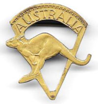 1). WWII victory pin. It is made from a bronze, brass plated Australian penny, 1938-1952. It is cutout in the shape of a V, for victory, showing the country name across the top with a kangaroo below. The kangaroo is an unofficial symbol of Australia and appears as an emblem on the Australian coat of arms. On the back is a bust of George VI and a pin for wearing.