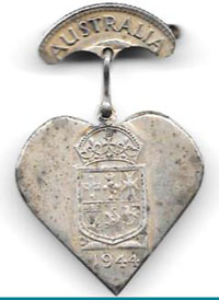 2). This pin is made from two silver Australian coins. The pin bar reads Australia and shows reeding across the top with a pin on the back and was cut from an Australian Shilling, 1938-1950. The suspended pendant was cut from a 1944 Australian Florin into the shape of a heart.