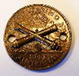 3). Bracelet coin. It was made from a silver, 1943-S Australian Florin. Soldered on the coin reverse are crossed cannons, the U.S. insignia for a field artillery unit. The two holes indicates it probably a center coin in a bracelet.