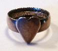 4). Hammered coin ring. This ring is made from a silver, Australian Florin, 1938-1945. Attached to the front of the ring is a silver heart. These rings were made by pounding or hammering the edge of a coin while rotating it. The coin got wider and smaller. The center of the coin is then cutout and the coin becomes a ring. The legends around the edges of the coin roll over when pounded and can be read on the inside of the ring. The heart was probably cut from the center plug cut out of the ring. The inscription on the inside of the ring reads, “GEORGIVS VI D:G:BR:OMN:REX F:D:IND:IMP//*FlO+RIN* Australia”.