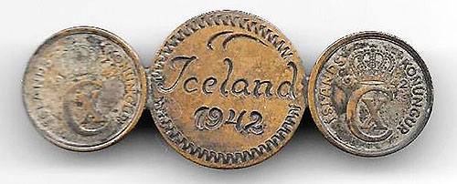 5). Three-Coin Brooch. This piece is made from three bronze Iceland coins; two, 1942, 1 Eyrir coins; one, 2 Aurar coin which is engraved “Iceland 1942”. A pin is mounted on the back.