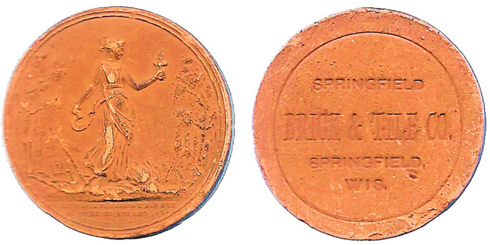 Shown below is a medal made of red clay. It measures 54mm, 6mm thick with a weight of 22 grams. The obverse features Ceres, the Roman Goddess of Agriculture, grain crops, fertility, and motherly relationships. Her right hand holds a sickle. Her left hand grasps a fist of grain. At her feet is a plow and other agricultural implements. At the bottom is a bible quote from the Old Testament, Psalm 67: Verses 5-6, THEN SHALL THE EARTH YIELD HER/INCREASE: AND GOD/EVEN OUR GOD SHALL BLESS US. The reverse reads SPRINGFIELD/BRICK & TILE CO./SPRINGFIELD, /WIS.