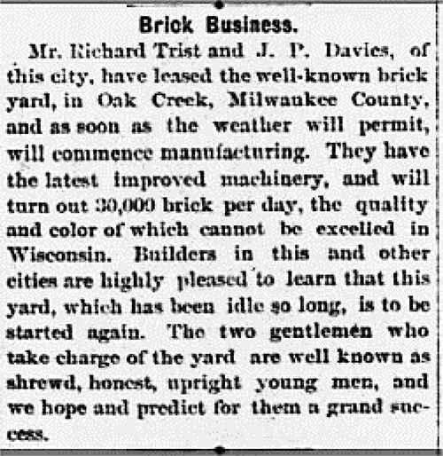 The owner Richard Trist was born in 1849 in Devonshire, England and came to America in 1853. He arrived in Milwaukee County with his parents. In 1863 during the Civil War, he enlisted in the Army at age 16 and became a drummer boy for Company B, 1st Heavy Artillery Regiment. He mustered out in 1865. In 1866 he was shot in a hunting accident and resulting in the loss of his left arm. He arrived in Racine in 1868 and permanently resided there. According to The Journal Times of Racine, in 1882, Trist and a partner started a brick business in Oak Creek, WI. There is no further information concerning this brick business, however, for 25 years Trist was the general freight and passenger agent for the Chicago & Northwestern Railroad. He died in 1928 at the age of 81 and is buried in Racine.