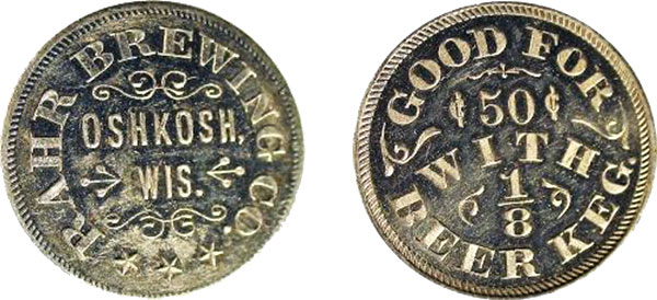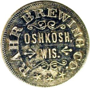One of Rahr’s advertising ideas that was relatively unique among brewery promotionswas this aluminum trade token. The Obverse reads; RAHR’S BREWING CO. / OSHKOSH, WIS. The Reverse reads; GOOD FOR / 50c WITH 1/8 / BEER KEG.