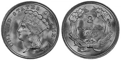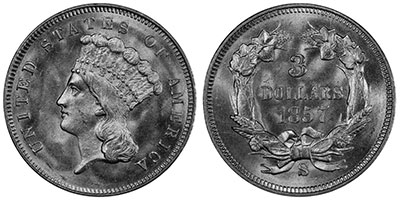 These first three issues of $3 gold pieces give us something of a set of numbers for the highs and lows within this series. In 1853, the folks at the Mint in Philly probably didn’t know it, but this would be the biggest single mintage for the entire set, even though they would be produced up to 1889. The 1854 issue of Philadelphia is the only one ever to make it to six figures (the next closest is the 1878 with 82,304 as its official tally), making it the most common date in the series. Today, it will cost about $1,000 to land one in a grade such as EF.