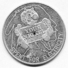 The impetus for this article is my acquisition of two tokens featuring the Reddy Kilowatt character. The first, a 32-mm, aluminum spinner token (Fig. 2), includes a drawing of Reddy Kilowatt holding a sign that reads “YOUR NICKEL” above the caption “SPENT FOR ELECTRICITY”. An outline of the Native American Indian head from James Earl Fraser’s buffalo nickel comprises the background. The reverse features Reddy posed with outstretched arms under the caption “THE BIGGEST NICKEL IN TOWN”. An outline of a Fraser’s buffalo is visible in the background.