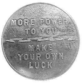 The obverse of the second token, a 32-mm brass advertising piece (Fig. 3), depicts Reddy plugged into a wall outlet encircled by “REDDY KILOWATT / YOUR ELECTRICAL SERVANT”. The reverse simply reads “MORE POWER / TO YOU” and “MAKE / YOUR OWN / LUCK” separated by a lightning bolt.