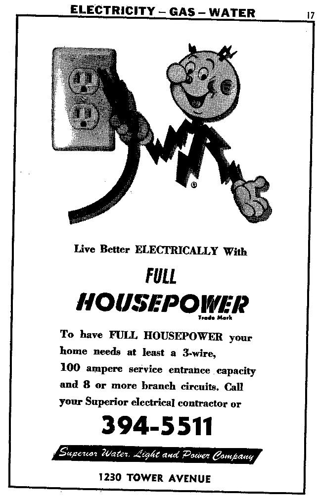 Not shockingly, the success of Reddy Kilowatt prompted competitors to develop similar mascots. Rural electric cooperatives and public utility districts benefited from Willie Wiredhand, a character developed in the early 1950s by the National Rural Electric Cooperative Association. Like Reddy, Willie was a stick figure, but with a lamp socket for a head and an electric plug for legs and feet (Fig. 4). Reddy Kilowatt, Inc. and over 100 power companies filed lawsuits against the NRECA, alleging copyright violations and trademark infringement, but got zapped when the U.S. District Court of Appeals found the two characters distinctly different. It didn’t take long for other electrical enterprises to develop their own mascots (Fig. 5).